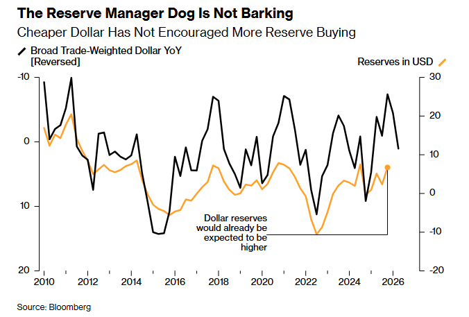同样的论点也可以用于黄金。各国央行的持有量,可能只是被动受益于近年来金价上涨。但如果将调整后的美元储备视为这种货币的“实际权重”,那么自2014年前后官方持有美元达到峰值以来,这一权重已下降15%。
