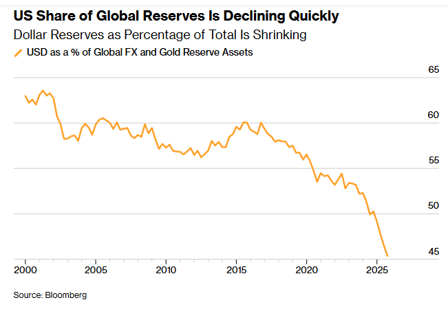 减少持有美元资产正变得越来越合理。一旦这一点成为共识,就很难不看到美元主导地位将随着时间推移持续削弱,而黄金的地位将进一步上升。