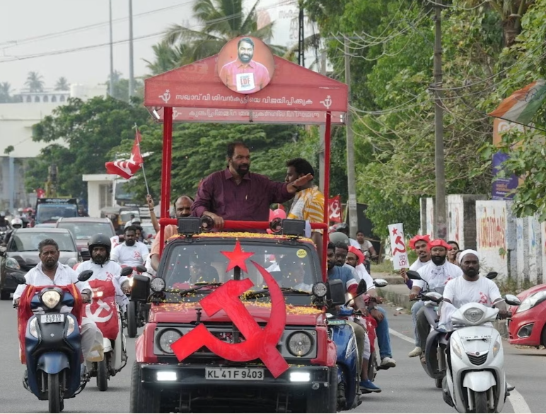 在震耳欲聋的烟花声和赤膊鼓手的节奏中,一支悬挂镰刀锤子旗帜的吉普车队驶入卡拉迪查穆拉——一个位于南部喀拉拉邦首府附近的村庄,为周四的邦选举举行最后一场集会。