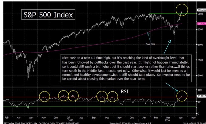 分析方面,即使没有关于霍尔木兹海峡通行受限制的消息,考虑到近期强劲上涨,美国出现回调也很有可能发生。盈透证券首席市场策略师马特·马利指出,自3月30日以来,标普500指数已上涨12.3%。图表显示,标普500的14日相对强弱指数已经升破70这一水平。这是一个关注度很高的动量指标,70通常被视为处于超买状态的门槛。马利表示:“这波上涨很好,创下历史新高,但已经进入一种超买区间。在过去一年中,这种水平之后往往会出现回调。”
