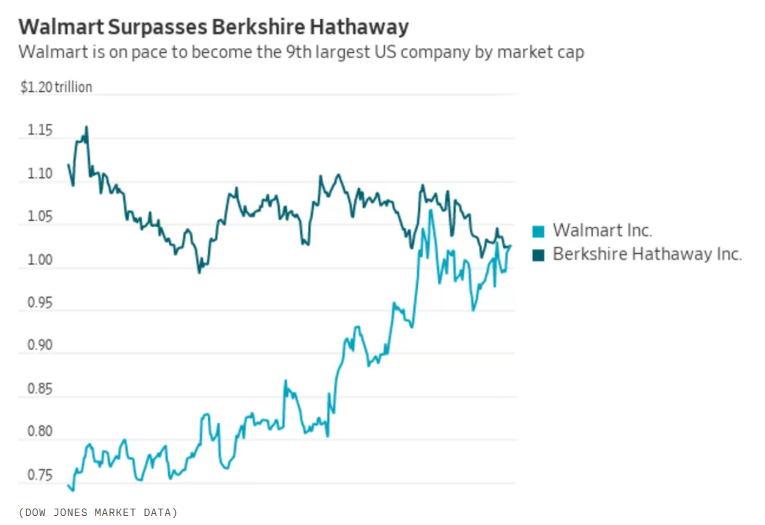 沃尔玛周一超过伯克希尔·哈撒韦,成为美国市值第九大的公司。沃尔玛上一次达到这一排名是在2021年1月4日,而市值上一次超过伯克希尔·哈撒韦是在2013年4月18日。