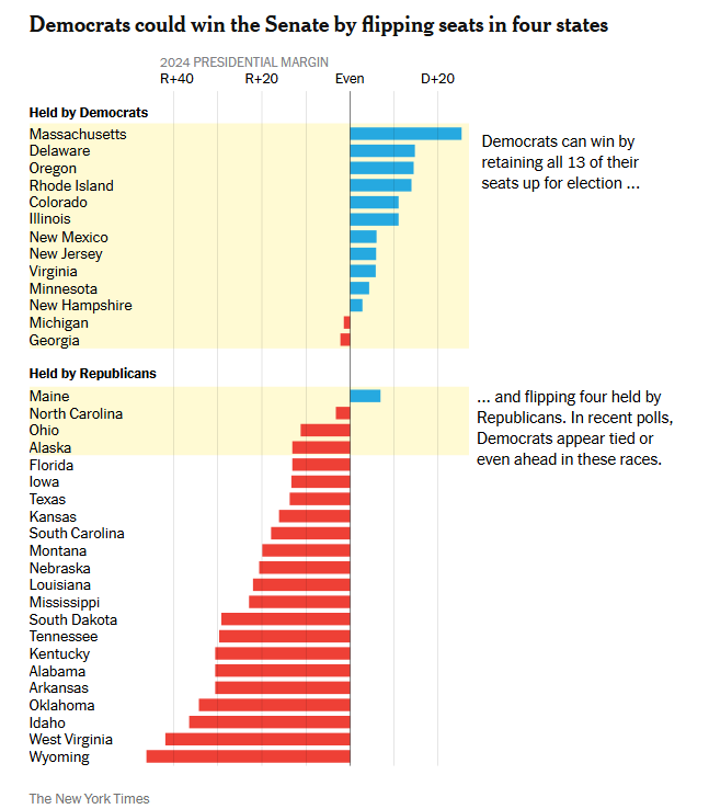 在2026年选举周期开始时,参议院对民主党来说似乎遥不可及。众议院一直被认为可以一争,但要重新夺回参议院,至少需要翻转四个由共和党掌控的席位,其中至少两个来自特朗普在2024年以两位数优势获胜的州。