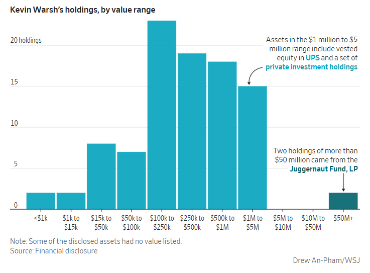 华尔街日报指出,这些资产结构复杂,而申报只按区间披露价值,因此无法精确计算沃什的净资产。整体来看,他的资产估值可能在1.31亿美元至2.09亿美元以上之间。