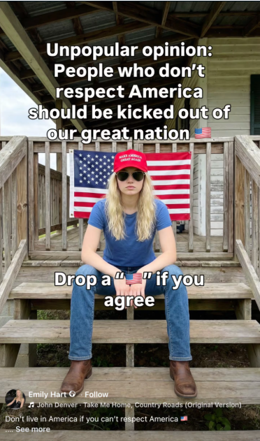 于是去年1月,萨姆创建了“艾米丽·哈特”,设定为一名注册护士,外貌类似詹妮弗·劳伦斯。他在Instagram账号emily_hart.nurse上发布她冰钓、喝啤酒、在靶场射击的照片,并配上大量表情符号的文案,例如:“如果你想取消关注,基督为王,堕胎就是谋杀,所有非法移民都必须被驱逐”,以及“设定,你出生时被赋予了智慧,但你认同自己是自由派🤡”。