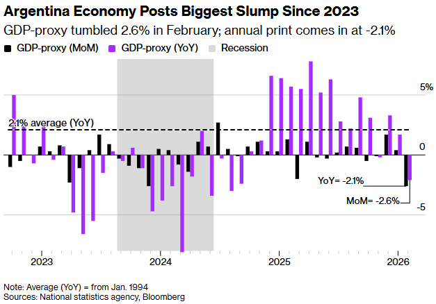 国家统计机构周三公布的数据(作为国内生产总值的替代指标)显示,2月经济活动同比下降2.1%。这是自2024年以来最大的同比降幅。当时,作为自由意志主义经济学家的米莱刚推出了大规模紧缩政策。