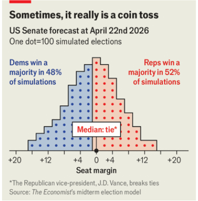 更令人意外的是,尽管参议院版图在表面上几乎坚不可摧,模型仍估计民主党有46%的概率夺回控制权。