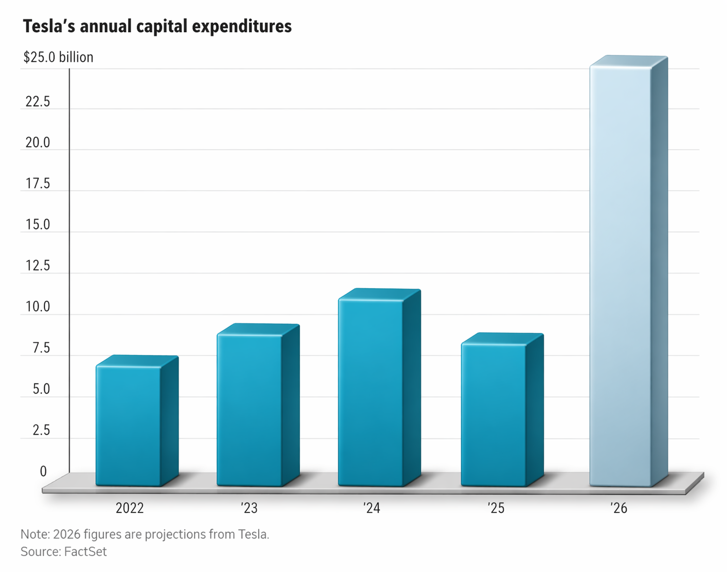 马斯克已明确表示,希望将特斯拉转型为专注于自动驾驶汽车和人形机器人,但这些产品目前尚未上市,这一转型需要巨额投入。250亿美元的资本支出高于此前200亿美元的指引,也远高于去年85亿美元的水平。