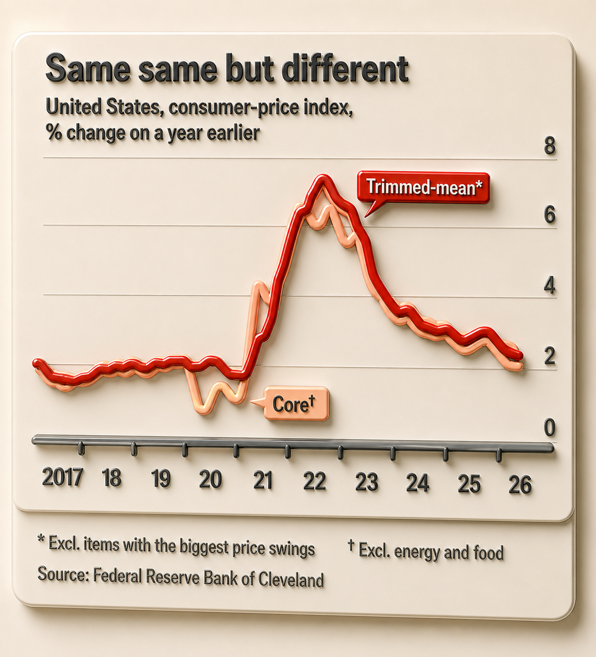 这令人安心。因为在政策方面,沃什往往只是一个边缘的改革者。像一个真正的政策专家一样,他经常对一些细节问题最为在意。他最不满的一点,是决策者过于关注“核心”通胀——即剔除波动较大的食品和能源价格,而忽视“截尾均值”指标,后者会剔除每月涨跌幅最大的价格。