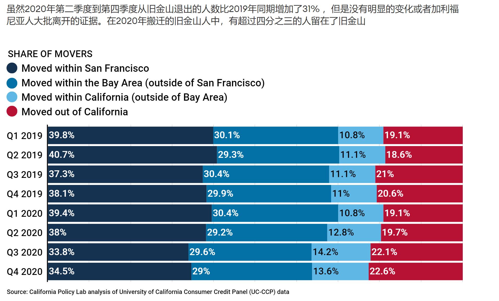根据加州政策实验室(California Policy Lab)的数据,自2014年底以来,无论是在加州内还是在加州外迁居的加州人的比例一直稳定在每个季度4%左右。2020年第三季度,全州居民的流动性实际上比一年前低了9%。