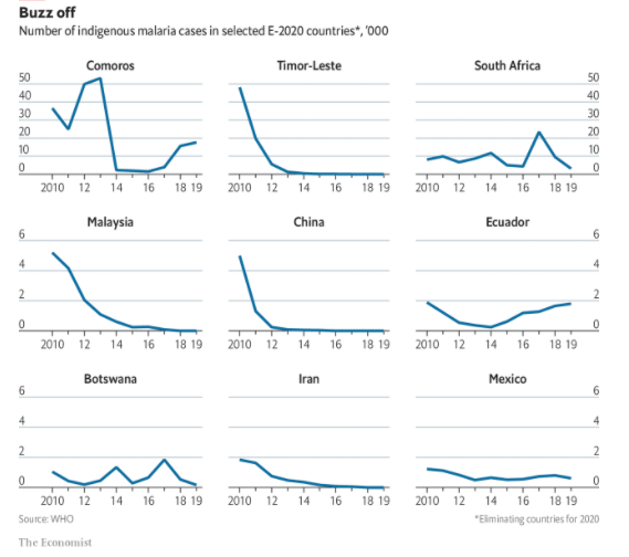 其他国家在消除这一疾病方面遇到了困难。南非的疟疾病例从2010年的8060例激增到2017年的23381例,这可能是一场特别严重的季风所致,因为积水推动了蚊子的繁殖,之后在2019年又减少到3096例。