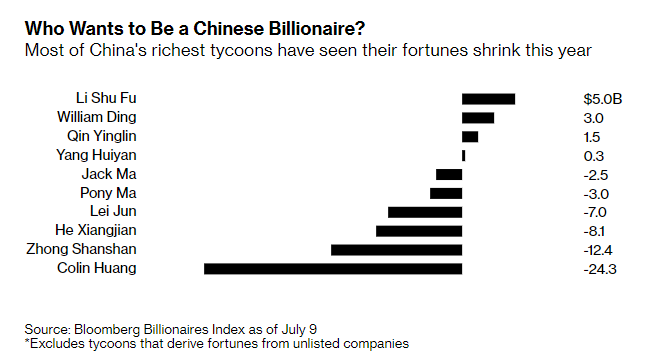 即使在2021年上半年,世界上最富有的10个人的净资产增加了2090亿美元,但彭博亿万富翁指数中,中国最富有的富豪们的财富总额却缩水了160亿美元。在此期间,他们的旗舰公司的股票平均下跌了13%,这是至少六年来他们第一次在中国股市大盘上涨时出现下跌。滴滴的股票自6月30日在纽约证券交易所上市以来,已经暴跌了14%,公司联合创始人的财富总共减少了近8亿美元。