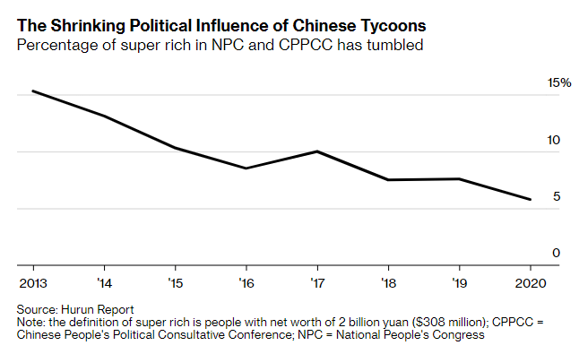 亿万富翁影响力减弱的一个更微妙的迹象,可以从他们在政治任命中的份额中看出端倪。胡润百富榜的数据显示,在中国人民政治协商会议和全国人民代表大会的代表中,富有企业家占比5.8%,为至少八年来最低,远低于2013年的15.3%。