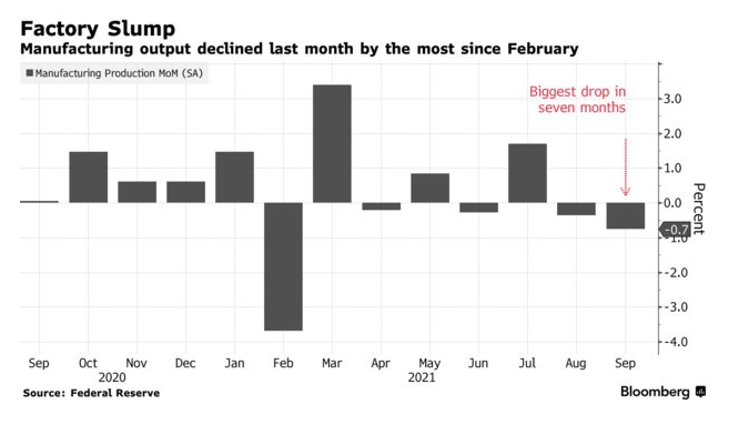 据彭博社报道,美国9月工厂产出创下七个月来最大降幅,这部分反映了汽车制造业的大幅下滑,以及供应链瓶颈和材料短缺问题。