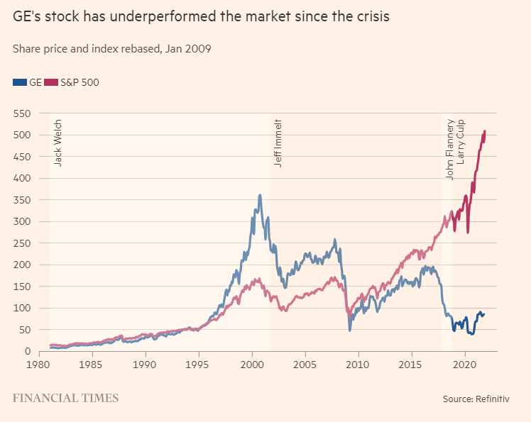 在20世纪90年代末和21世纪初的几年里,通用电气是美国最有价值的公司,它的市值在2000年达到了近6000亿美元的高峰。杰克·韦尔奇在2001年之前担任了20年的董事长兼首席执行官,成就了他管理业务界优良的个人声誉。