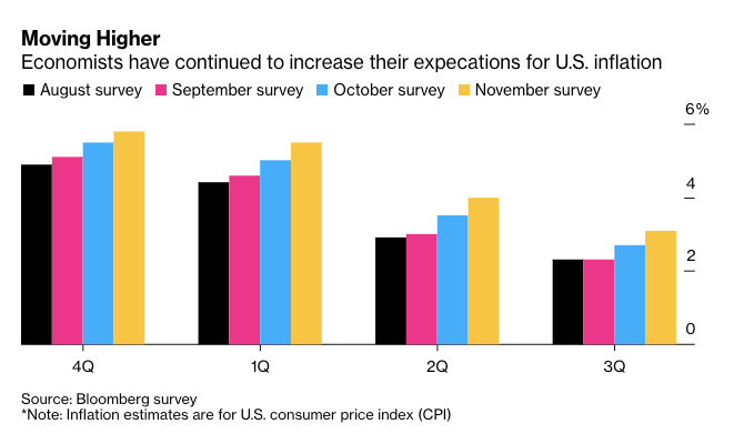 据彭博社报道,由于持续存在的供应链限制,再加上价格压力扩大到住房和能源等领域,经济学家正对2022年美国通胀提出更高的预测。