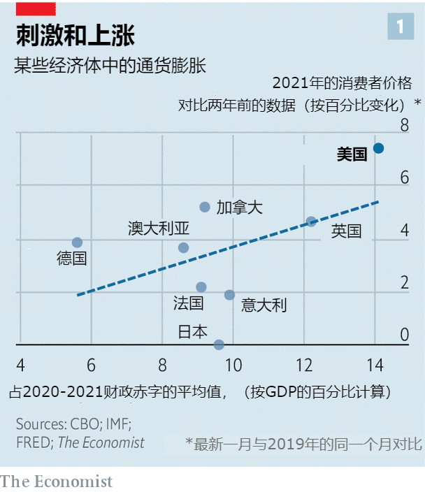 这种情况至少有一部分是本土的,这是因为美国在整个疫情期间采取了异常有力的促进增长政策。这些政策始于特朗普自豪签署的经济刺激支票,并在拜登的美国救援计划中变得更加慷慨大方。根据美国国会预算办公室的预测,在2020年和2021年期间,美国的财政赤字将平均占GDP的14%左右。与通货膨胀率一样,这比任何其他G7国家都要高。
