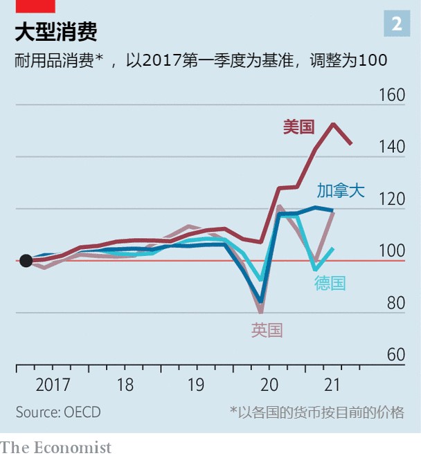 显著的经济刺激程度有助于解释美国零售业的蓬勃发展。毫无疑问,这场疫情使消费从服务转向商品。然而,即使考虑到这种扭曲,美国的数据也依然令人瞠目结舌。在2021年第二季度,耐用品的支出比2019年最后一个季度大约高出三分之一,远远高于以前的趋势,并轻松超过了其他大型经济体的增长(见图2)。