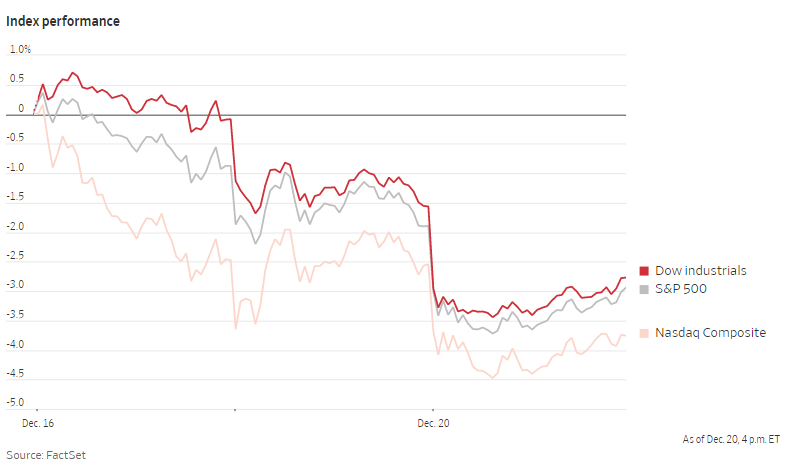 周一,投资者担心Omicron变种病例的增加将阻碍经济增长,并增加通胀压力,美股三大股指走低。道琼斯工业平均指数当天一度下跌逾600点,之后略有回升。截至收盘,该股指下跌约1.2%,跌幅达433点。这是该指数连续第三日下跌。标准普尔500指数下跌1.1%,以科技股为主的纳斯达克综合指数下跌1.2%。