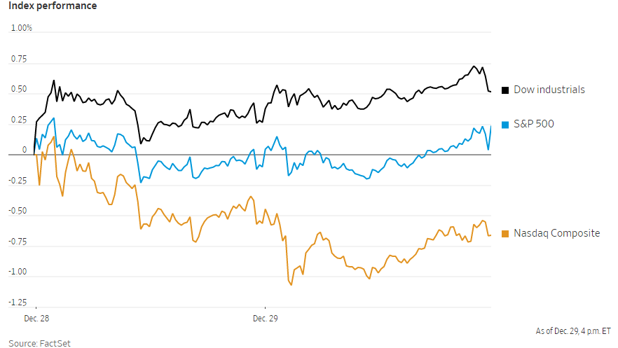 美国股市周三震荡,今年最后几个交易日成交量清淡加剧了这一波动。截至收盘,标准普尔500指数上涨0.1%,为今年以来第70次创下新高。道琼斯工业股票平均价格指数涨幅0.3%,也创下收盘新高,为连续第六个交易日上涨。而受科技股下挫拖累,纳斯达克综合指数下跌0.1%。