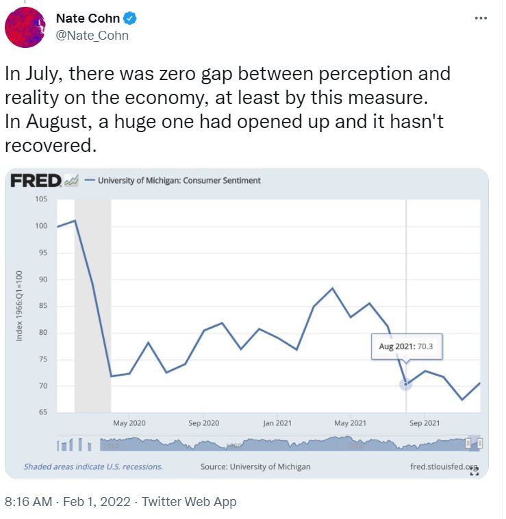 内特·科恩发布的图表:在2021年8月,美国人对经济的看法突然大幅下跌,此前与实际情况比较相符。来源:推特截图