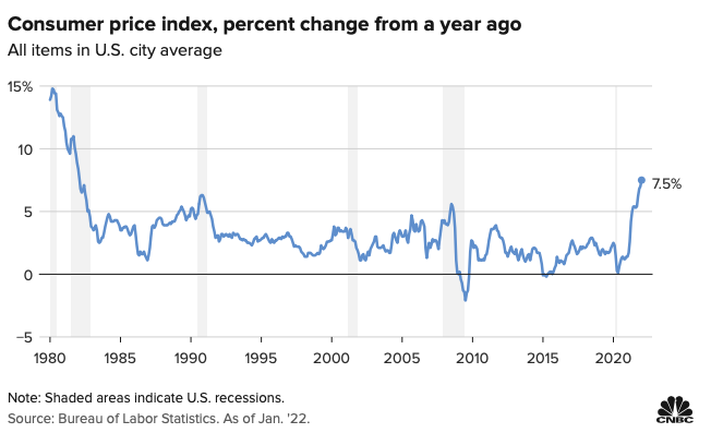 美国劳工部于周四(当地时间2月10日)报告称,衡量数十种日常消费品成本的CPI较上年同期增长7.5%, 是1982年2月以来的最快增速。 相比之下,道琼斯调查的经济学家曾预计,CPI将同比增长7.2%。