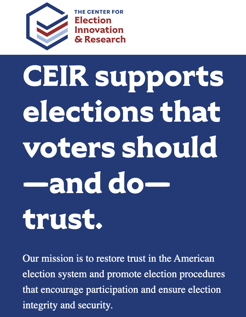 选举创新与研究中心声称:“我们的使命是重建美国选举制度的公信力,并倡导那些能促进参与度、确保选举公正性与安全性的选举程序。”