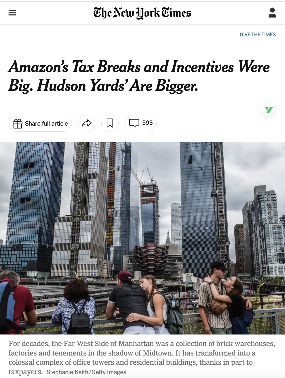 《纽约时报》2019年3月以《亚马逊的税收减免和激励措施相当可观。哈德逊园区的则更为丰厚》的标题报道哈德逊园区获得巨大政府优惠的事情