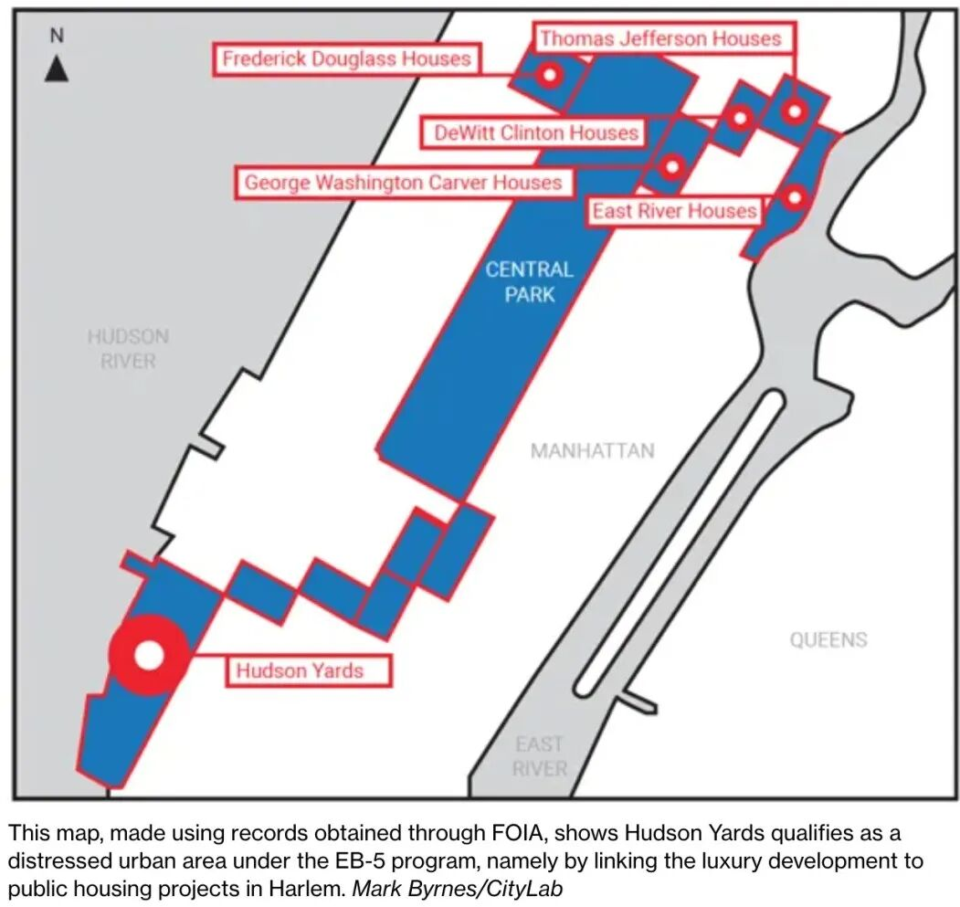 2)开发商通过EB-5签证项目筹集了逾10亿美元低成本资本。EB-5是一种投资签证,这类投资必须用于援助贫困地区。哈德逊园区那些璀璨夺目的摩天楼群当然不够格获得这种低成本资本。但投资商以卑劣的手法,借用中央公园将中哈莱姆及东哈莱姆的公共住房项目与这个西城精英聚居区连接起来(见下图,左下角是西城的摩天楼群,右上角是诸多公共住房项目),就可以申请EB-5签证投资了。想象一下,曼哈顿著名的中央公园成了贫困地区!