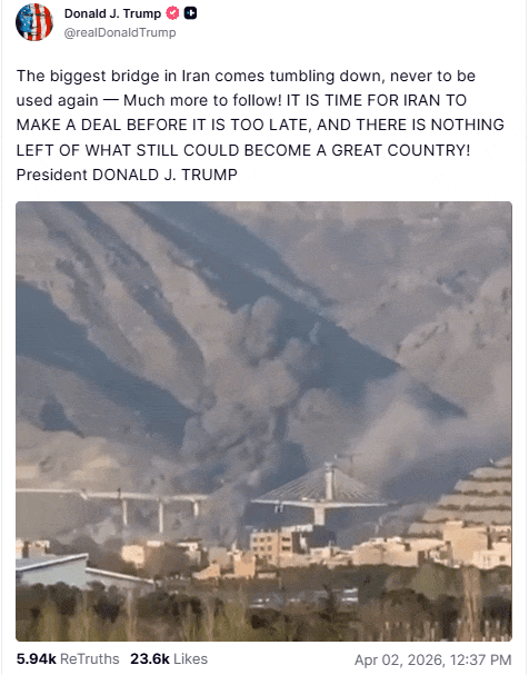 Trump warns Tehran ‘more to follow’ after strike destroys Iran’s largest bridge.