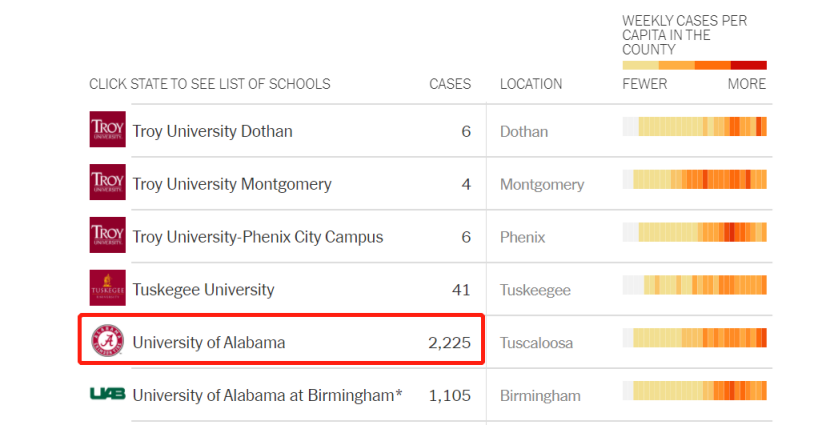 其中阿拉巴马州的大学感染情况最为严重,累计感染病例6249例,单个学校感染病例超过1000的就有3家,受灾最严重的阿拉巴马大学感染人数高达2225例。
