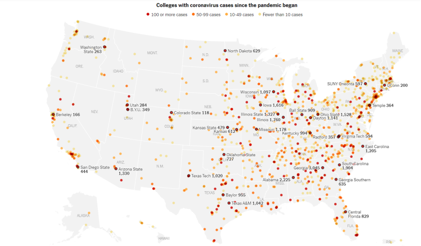 全美50个州均有大学或学院报告校内人员新冠确诊病例,迄今发现新增超4万人感染,实际数字可能更高。