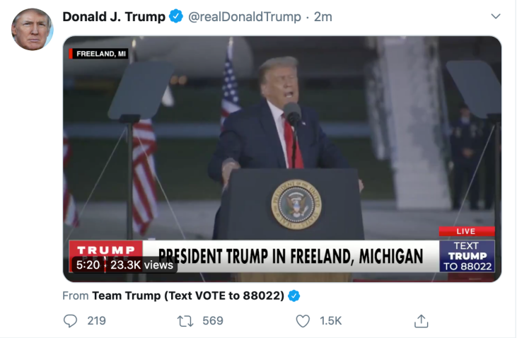 然后他跑去了密歇根州,在弗里兰的一个飞机库里召开竞选集会,大谈橄榄球以及让大学开学,向他的支持者抱怨“假新闻”,吹嘘“我们给你们带来了很多汽车厂,密歇根”。