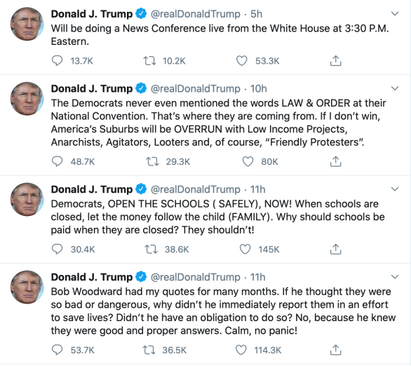 理论上说,总统任期里发生的灾难,板子都应打在总统本人的屁股上。但是万幸或者不幸的是,现在占着白宫的是特朗普,所以他继续在社交媒体重复“法律与秩序”的口水话、敦促民主党人让学生们返校,攻击伍德沃德。