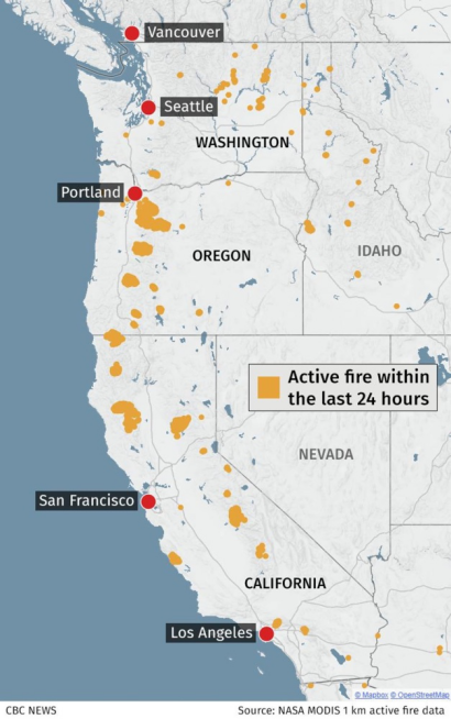 ·数十场由极端风力驱动的野火烧毁了美国西海岸各州的森林和城镇,华盛顿、俄勒冈有数千人面临疏散,而加利福利亚已经有6.4万人接到了疏散命令;
