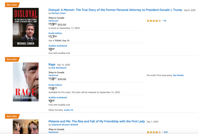 · 三本揭他负面的新书还在榜上,分别来自前幕僚博尔顿、亲侄女玛丽和前御用打手科恩,一本更新、影响力更大的又在路上了,鲍勃-伍德沃德的《狂怒》用不容动摇的证据证明了他曾经拿美国21世纪面临的最大危机新冠疫情上打马虎眼;