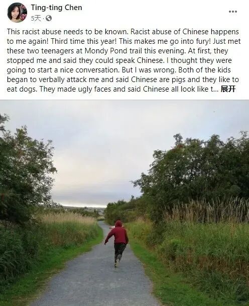 第三次,也就是最近这次事件,就发生在上周五,在St. John’s市的Mundy Pond trail 散步时,她遇到了两个白人少年,两个孩子看上去和普通中学生别无二致,“如果不是他们使用种族主义语言。”