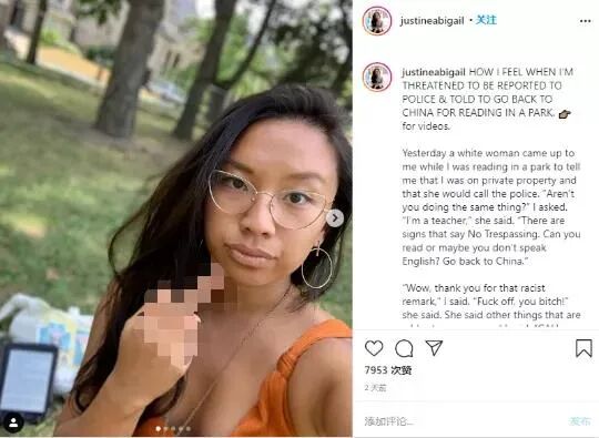 白人女子一听说道,“我是一名老师,你看那有禁止擅自进入的标志,你是看不懂还是不会英语?赶紧回中国去吧!”