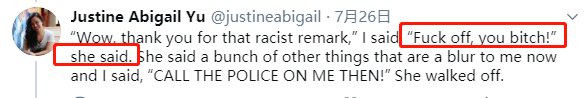 Yu一听,这明显是赤裸裸的种族歧视啊!她直接对白人女子说,“哇,谢谢你的种族主义言论。”