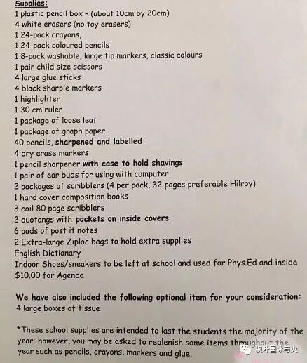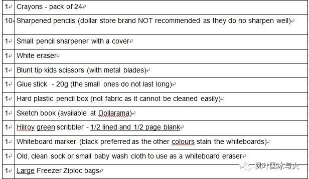 今年就相对简单,只需要准备12项(截图如下),基本都是常用物品。和国内学习用品准备最大的不同,可能就是不用准备超大号书包,这边一年级是没有教材的,都是老师随机打印的学习资料,所以要准备一个大号的带拉链的文件袋(Large Freezer Ziploc bags)。