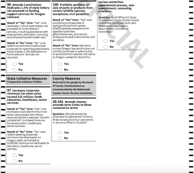 俄勒冈州在每一次选举的每一张选票上都会生成一个独一无二的条形码,用来识别选票的真伪、是否是重复选票、是否过期选票等等信息。该条形码还包含了拥有该选票选民的相应信息等等。