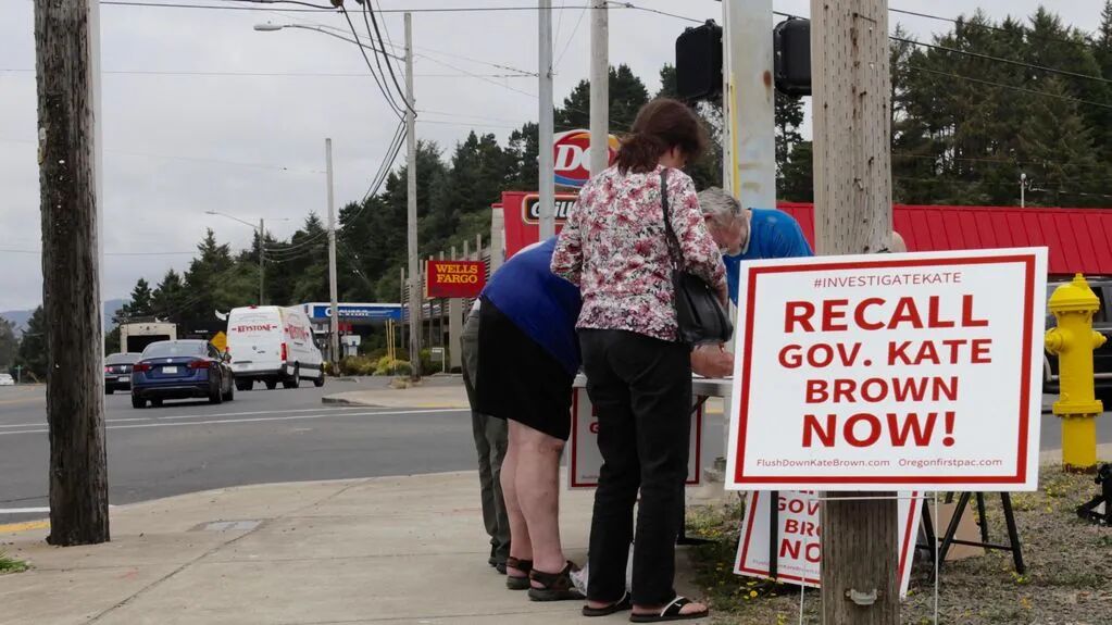 俄勒冈州的共和党正在路边收集签名,以便把罢免现任俄勒冈州长民主党人凯特.布朗的议案放到今年大选的选票上