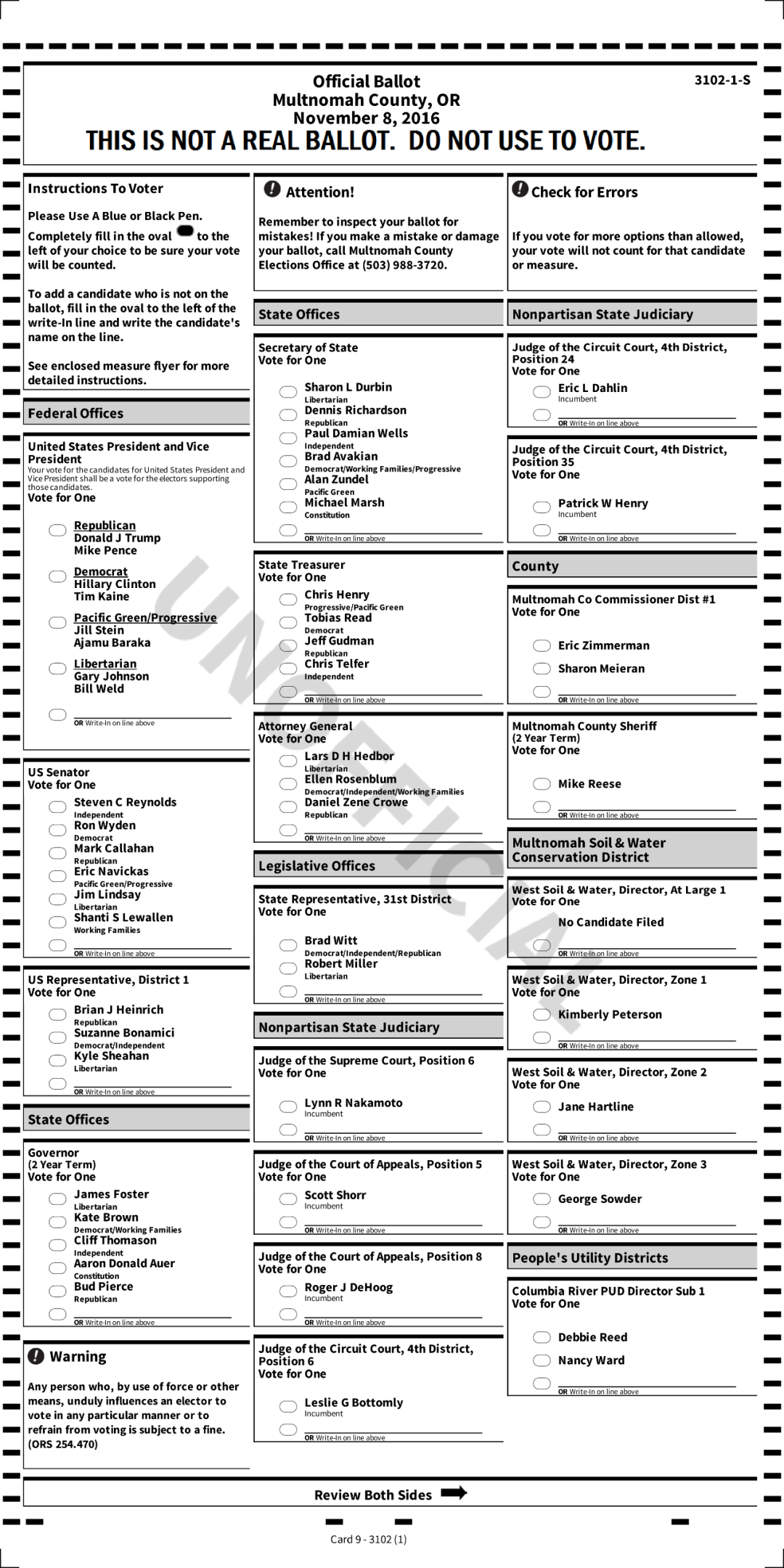 2016年大选时,仅仅是摩特诺玛(Multnomah county)一个郡,提供给各不同选区的选票就多达162种。考虑到俄勒冈州一共有三十六个郡,制造假选票的复杂程度和难度不下于制造假美钞。