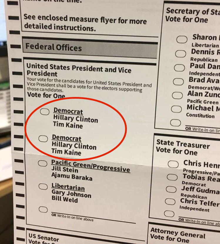 2016年大选时网络疯狂谣传一张PS过的俄勒冈的选票,上面没有共和党候选人特朗普的名字,而民主党候选人希拉里的名字则有两个。