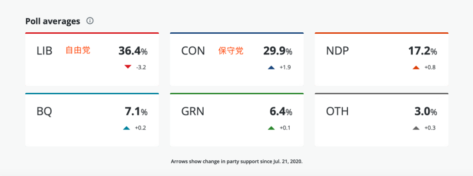 加拿大广播公司(CBC)在8月21日发布的一项民调显示,尽管自由党因丑闻导致支持率下滑了3.2%个百分点,但仍高于保守党的29.9%。