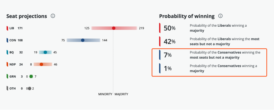 同一个民调显示,保守党想要赢下多数席位的概率低于7%。相反,调查显示自由党赢下多数席位的赢面仍然有50%上下。