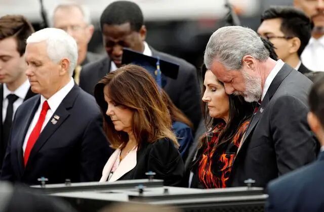 法尔韦尔夫妇(右)和彭斯夫妇(左)出席宗教活动