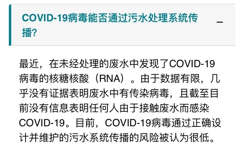 事实上,这个检测是用来评估社区新冠传播的程度,和其他指标一起可以预测新冠传播范围以及隐藏的新冠阳性患者的数量。而就目前学术界掌握信息来看,病毒通过污水传播的风险很低。民众需要警惕的,并不是新冠可能通过水系统传播,而是社区中可能存在被检测系统漏掉的阳性病例。