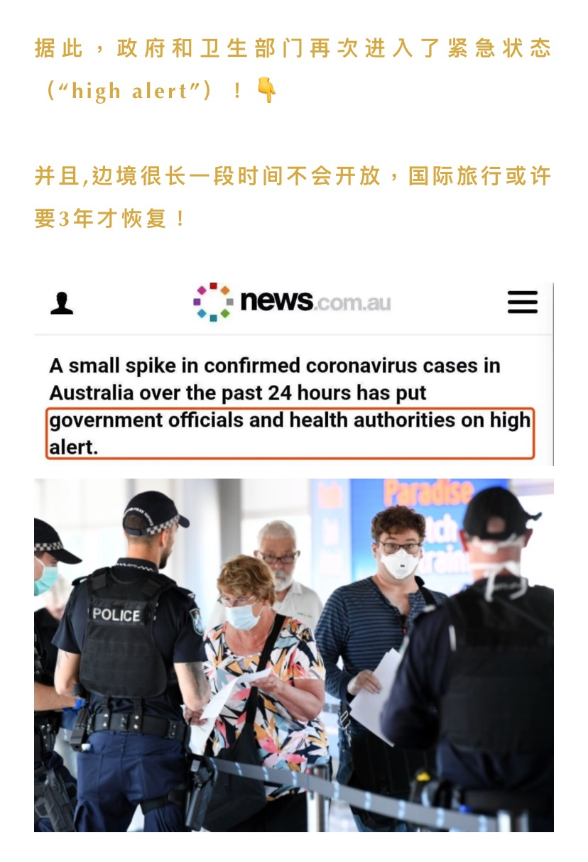 例如上文所述,悉尼星尚5月14号的文章“今天,澳洲再次进入紧急状态!病毒这次变异了!!”澳洲再次进入紧急状态的信息来源自News.com.au。公号给了原新闻的截图,图中英文报道“紧急状态”对应的用词是 high alert。