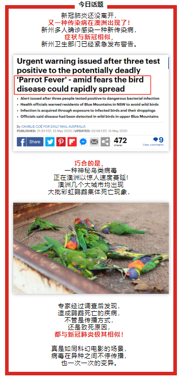 这篇文章混合杂糅了两篇英文报道。一篇是每日邮报 5月14号关于新州蓝山区域发现三例鹦鹉热确诊病人的报道1。一篇是ABC 5月1号关于昆州一些鹦鹉之间流传的传染病的报道2。这两篇报道的发表时间不同,媒体不同,地点不同,所报道的事件完全独立。但在今日悉尼的公号文章中,这两篇本来没有联系的英文报道被黏合成了一篇,给读者一种一个新的和新冠类似的疾病正在爆发的印象。