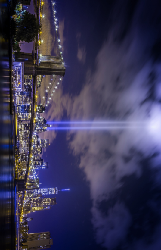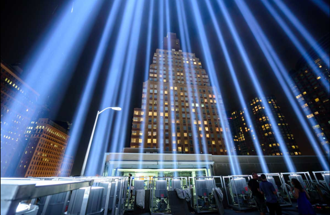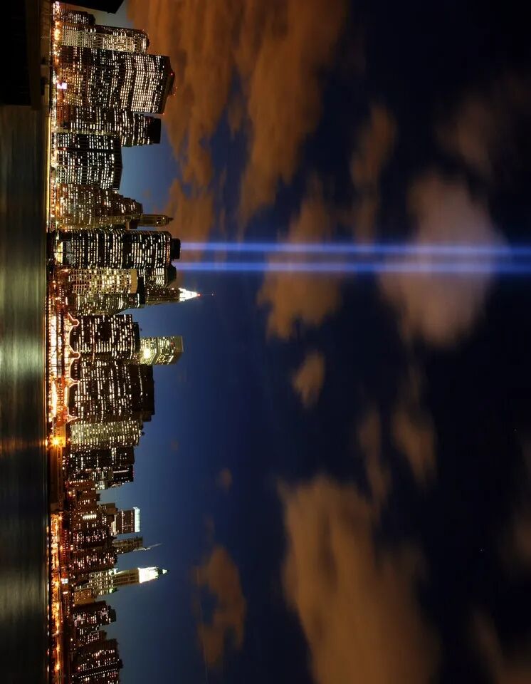 自2002年以来,“以光致敬”(Tribute in Light )就一直在纪念双塔袭击事件。它用88盏特制的灯,将致敬光柱投射到天空。两道光柱高达4英里,宛如双子塔的灵魂,在这个特别的纪念日彻夜耸立在纽约城的天空中,方圆60英里的范围内都可以看到它的雄姿,直到9月12日黎明的到来。